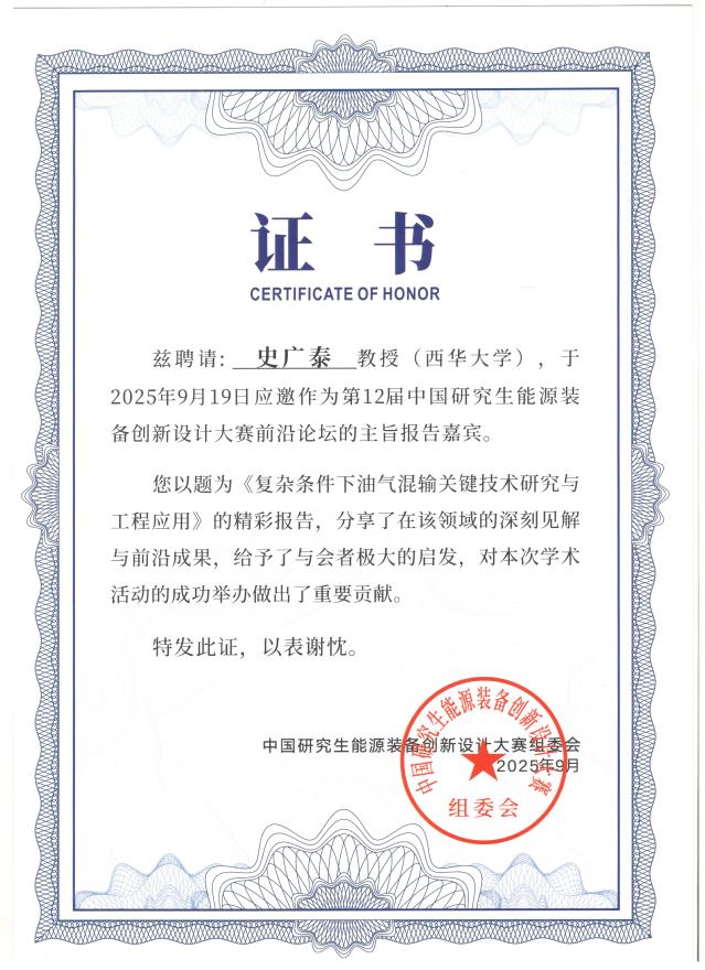此次受邀作大会主旨报告,不仅是对史广泰教授及其科研团队长期深耕能源装备领域所取得成果的充分肯定,也进一步彰显了永利官网地址在能源动力学科建设、科技创新与产学研融合方面的综合实力与影响力,为推动我国能源装备技术进步贡献了“西华智慧”与“西华力量”。
