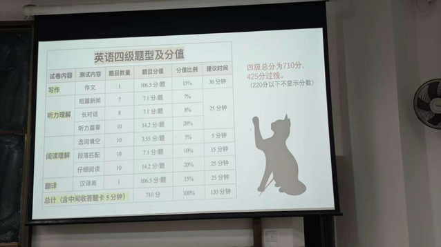 分享会伊始,付茂萍聚焦四级分值分布解析备考重点。她明确,听力与阅读各占35%(248.5分),写作与翻译各占15%(106.5分),强调“明晰分值才能精准发力,聚焦提分快的核心题型”。